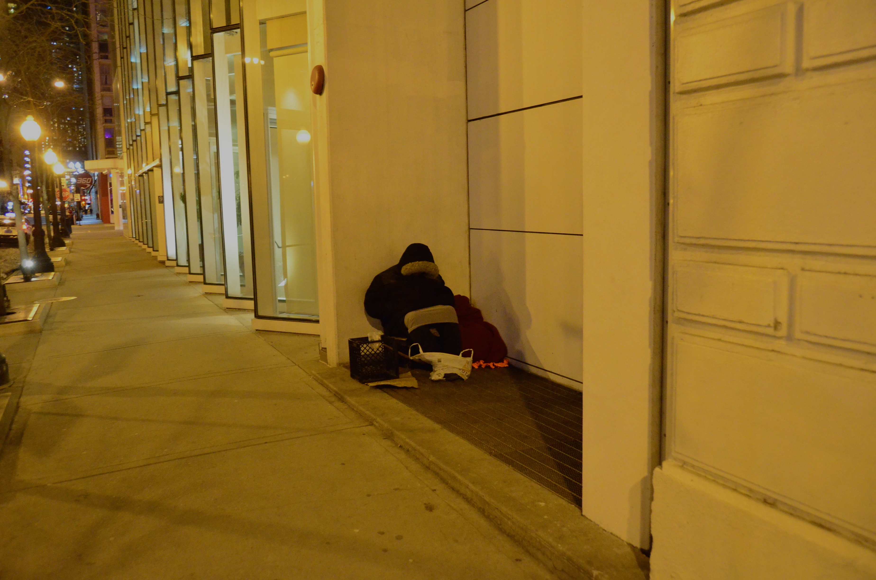 Most of the people who pan-handle on the streets of Chicago are not homeless. They may be drug-addicted, alcoholic or just plain broke, but the majority are not homeless. This middle-aged guy sleeps in this neighborhood regularly. It’s one of the richest zip codes in the city (60611). It was stinging cold that night. The warm-air grate he was sitting on is part of the Sofitel Hotel. A luxury hotel my any standards. Most businesses shoo the homeless away, but on very cold nights, the hotel manager lets this guy be. While certainly no grand solution, it’s one person’s way of making sure another person has another day.